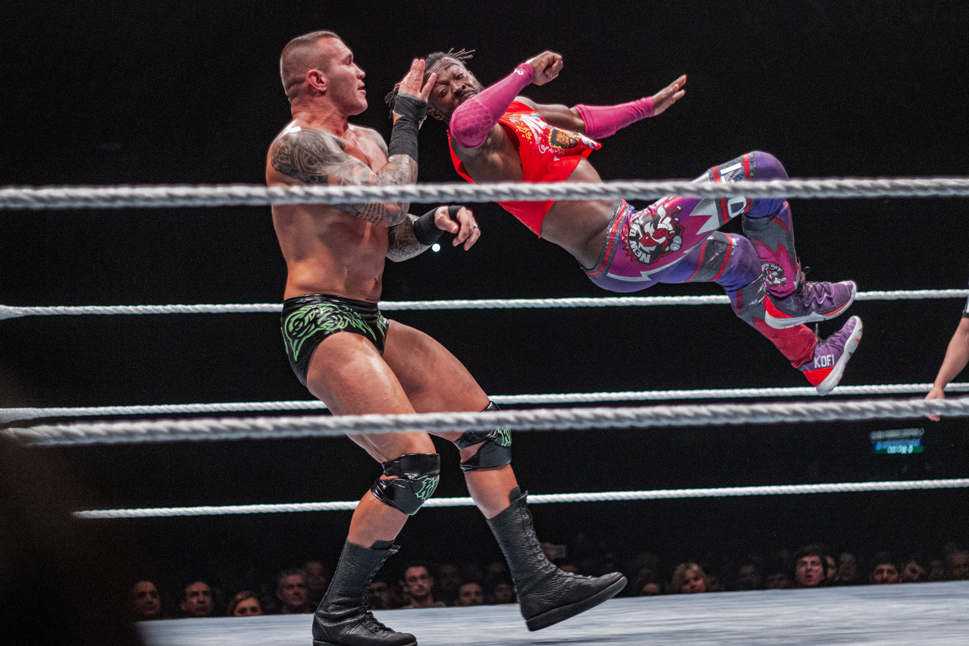 Vertigo ataca con una patada voladora a Chuca en el evento Espititu Guerrero 6 de Superestrellas de la Lucha el 18 de agosto de 2019 en Mariano Acosta, Buenos Aires, Argentina.