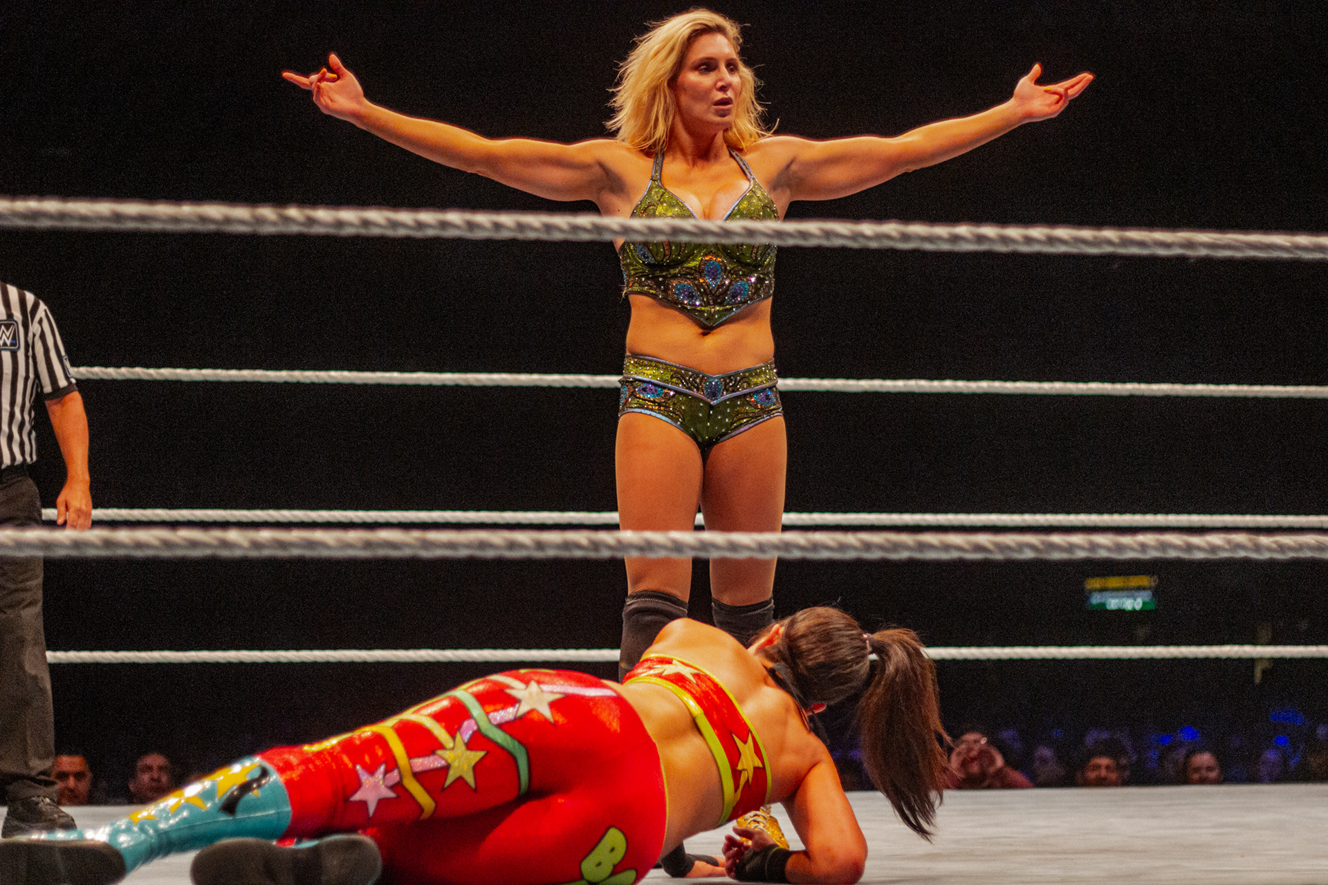 Charlotte aplica un boston crab a Bayley durante el WWE Live Buenos Aires en el Luna Park de Buenos Aires, Argentina el 6 de septiembre de 2019.