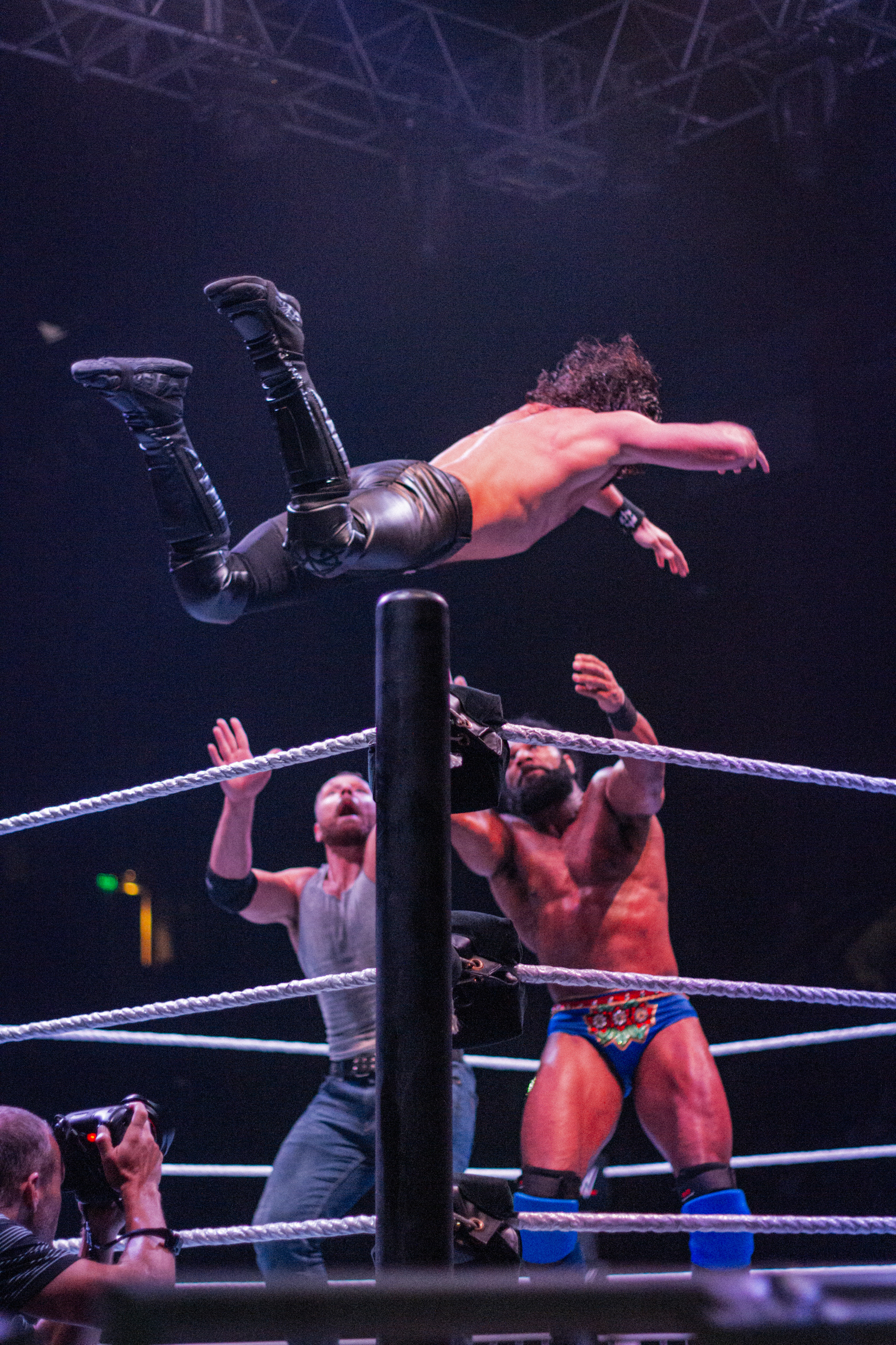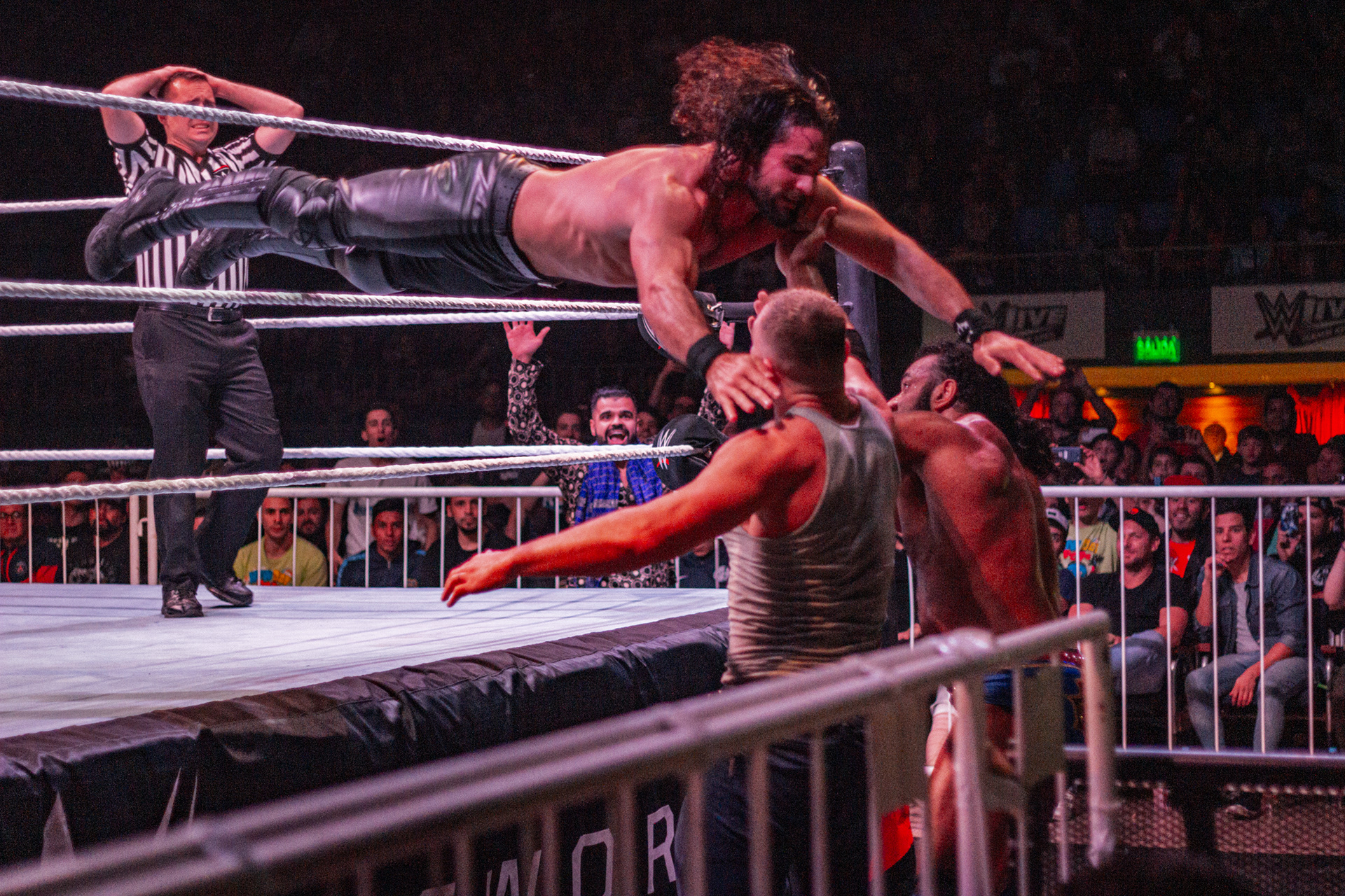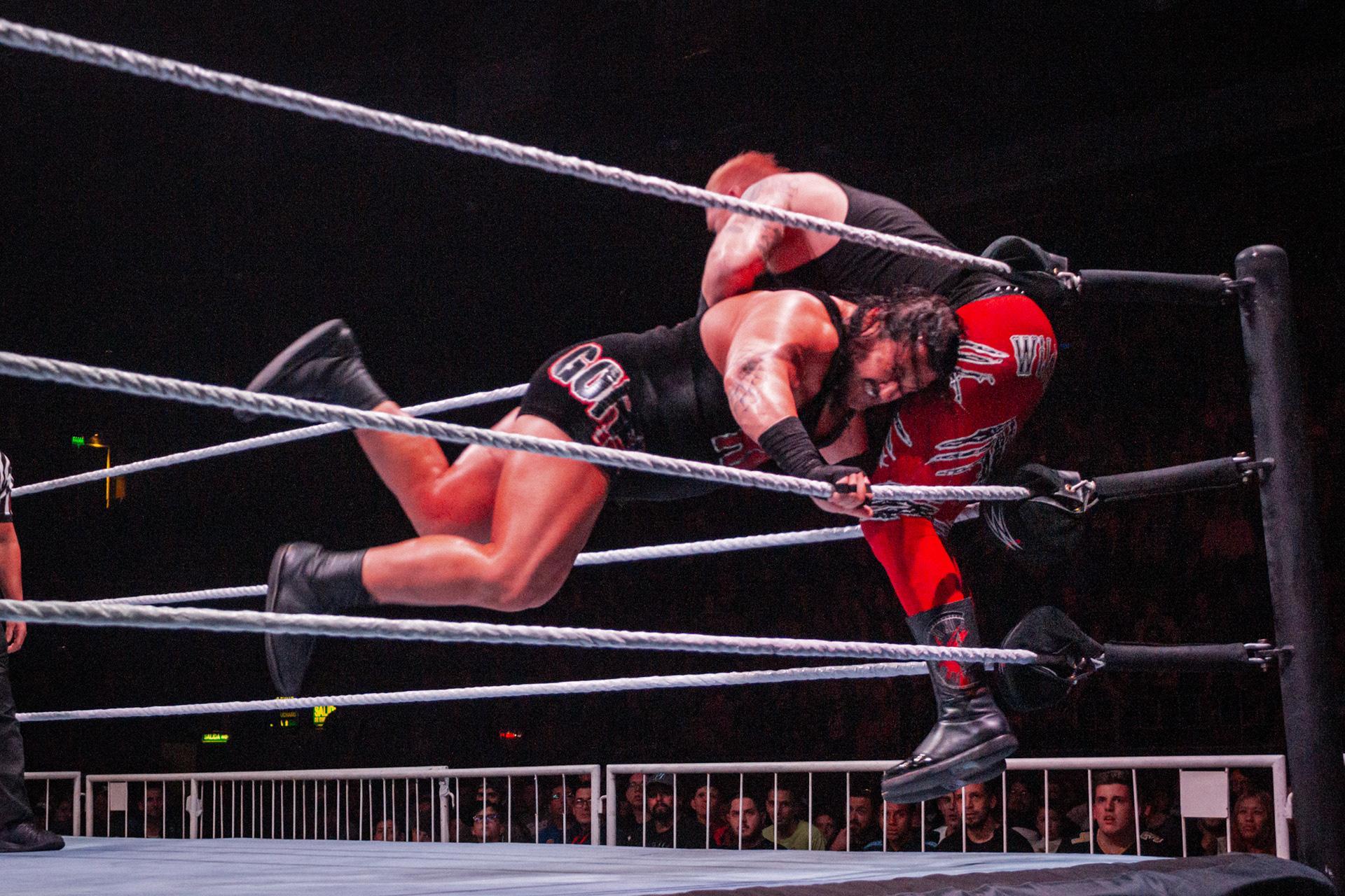 Vicente Viloni aplica un codazo volador sobre Rob Dickinson ante la mirada de Musamebe Tutu durante el evento Rock & Wrestling Reloaded 2018 de Lucha Extrema en Ramos Mejía, Buenos Aires, Argentina el 7 de octubre de 2018