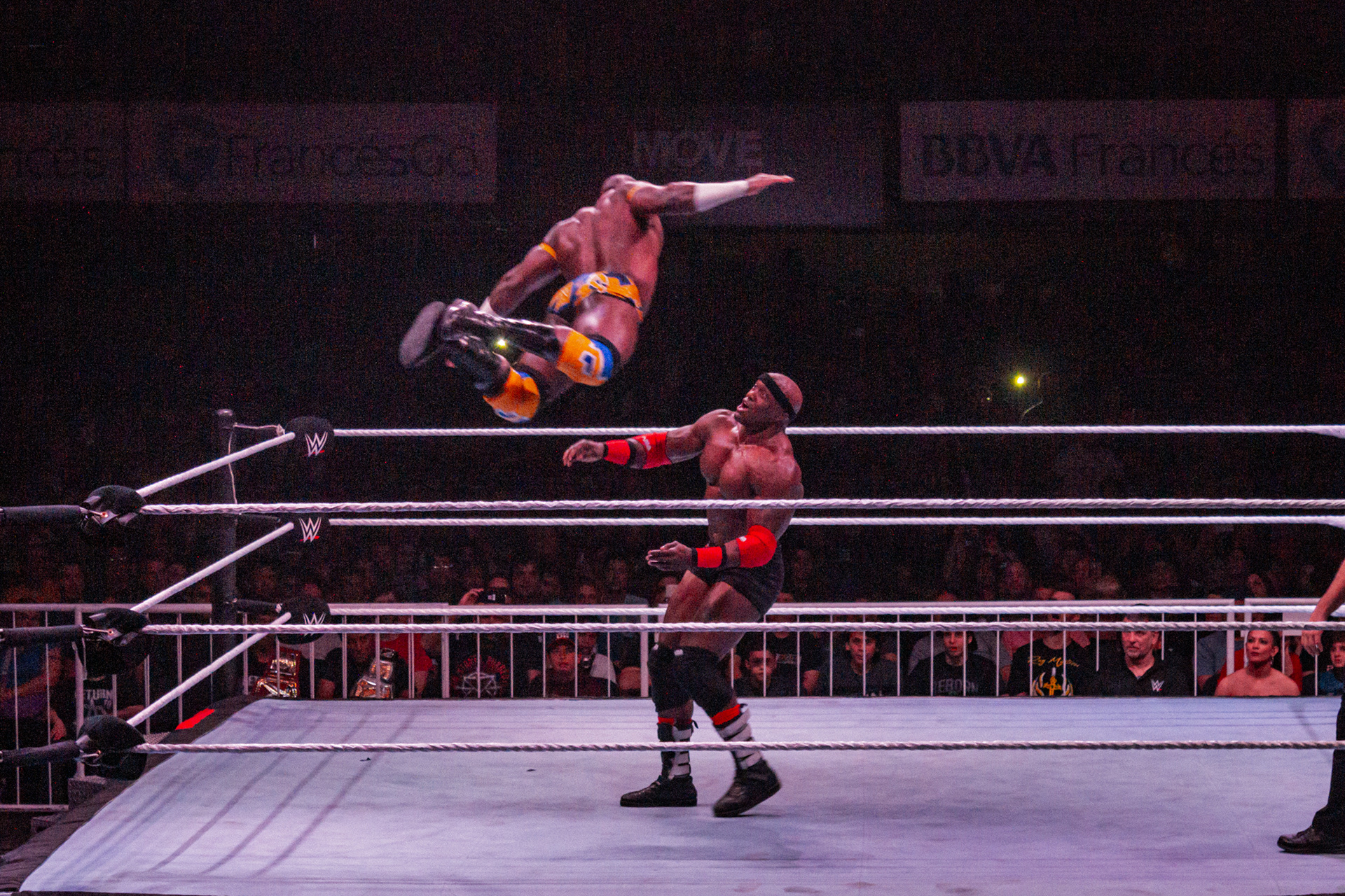 Kairi Sane aplica el insane elbow sobre Sonya Deville, mientras Asuka celebra en la esquina opuesta durante el WWE Live Buenos Aires en el Luna Park de Buenos Aires, Argentina el 6 de septiembre de 2019.