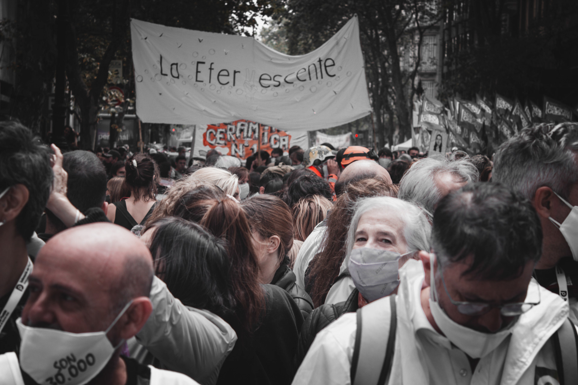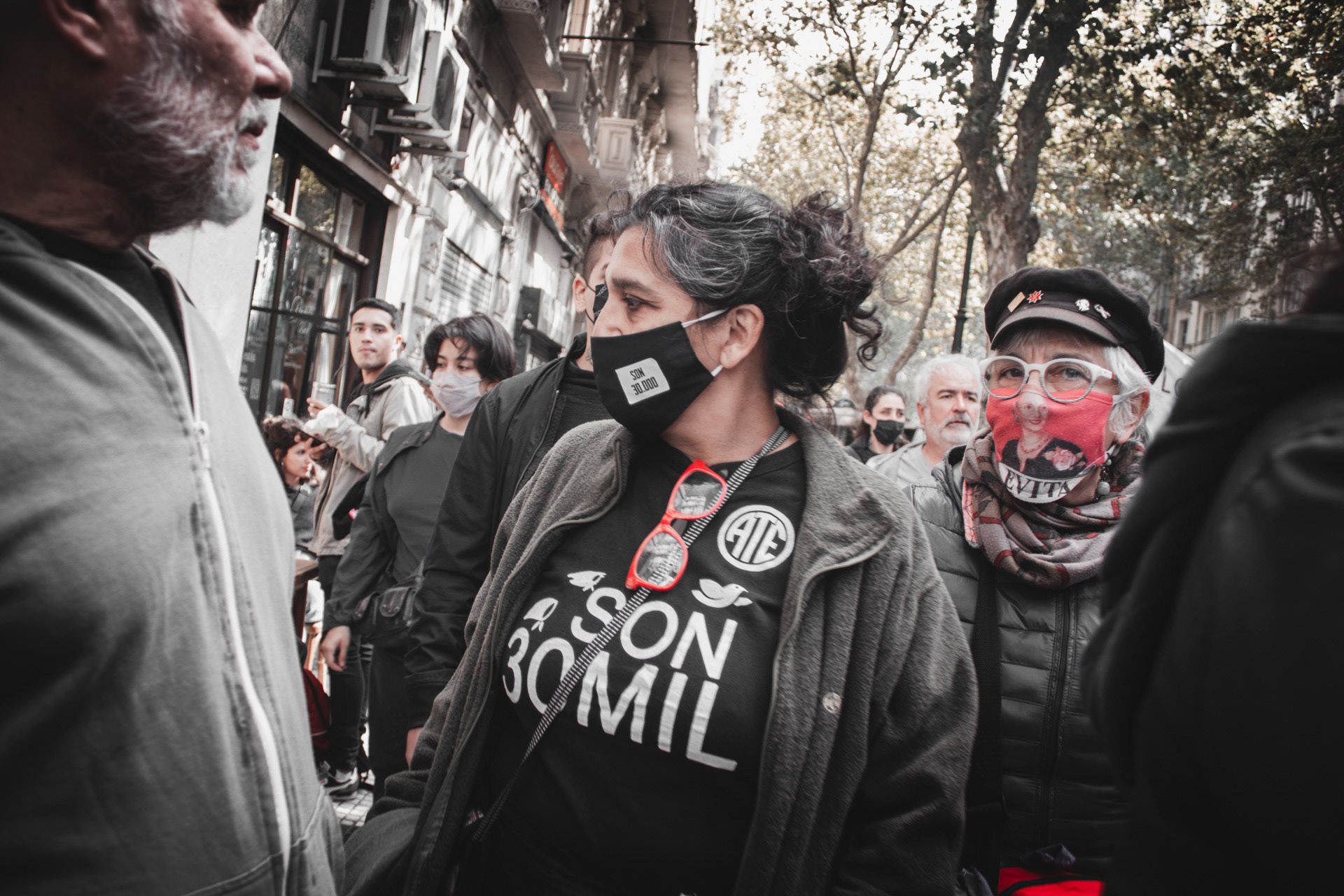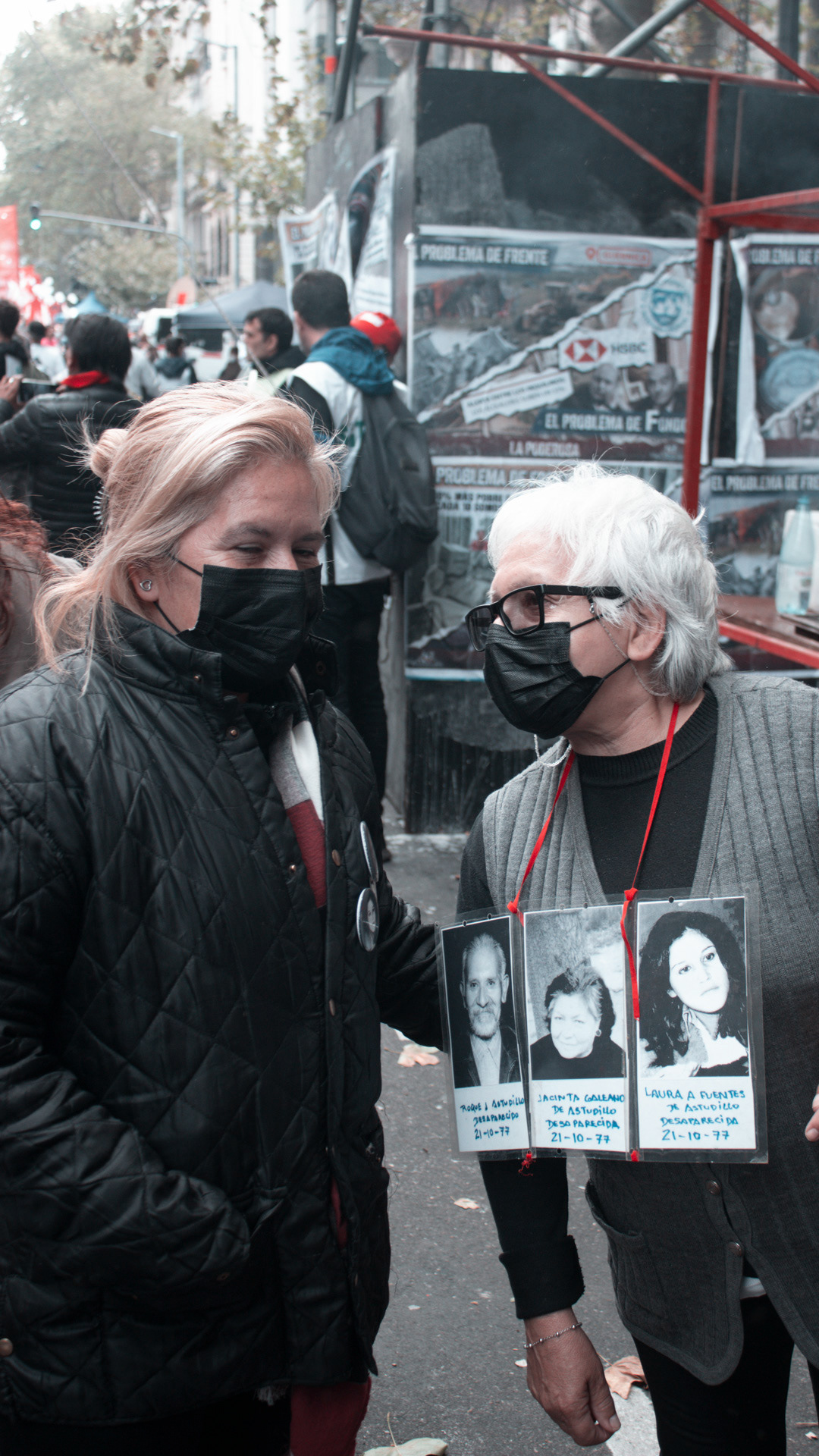 Un grupo de personas realizan una performance artística reclamando contra el acuerdo del Fondo Monetario Internacional en la marcha de conmemoración del 46º aniversario del último golpe militar en Argentina. El 24 de marzo de 2022 en la Ciudad de Buenos Aires, Argentina. Fue la primera marcha convocada por los principales grupos de Derechos Humanos en el país luego de la pandemia. Se convocó a intervenir barbijos con las principales consignas.